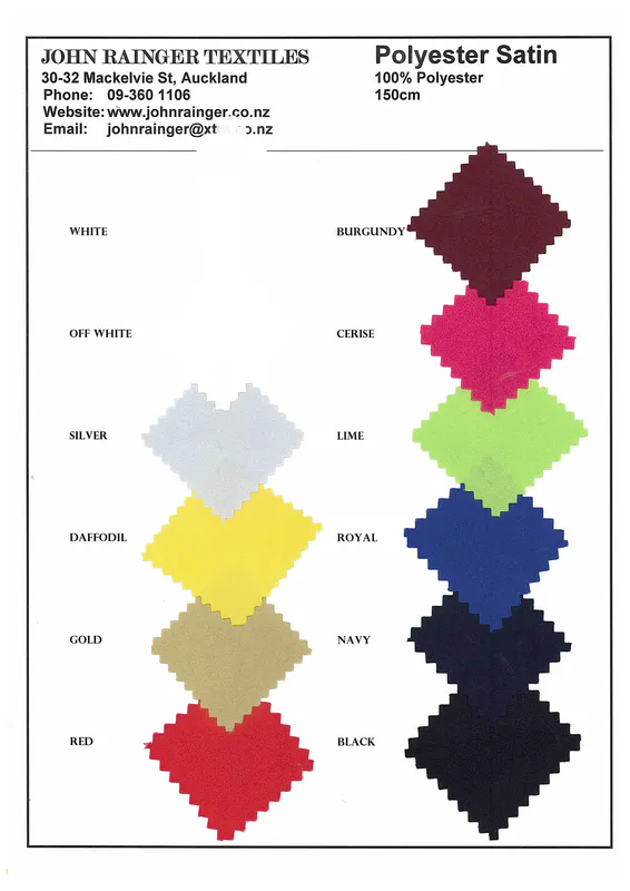 - Polyester Satin - 100% Polyester 150cm wide (Colours as per attached shade card)